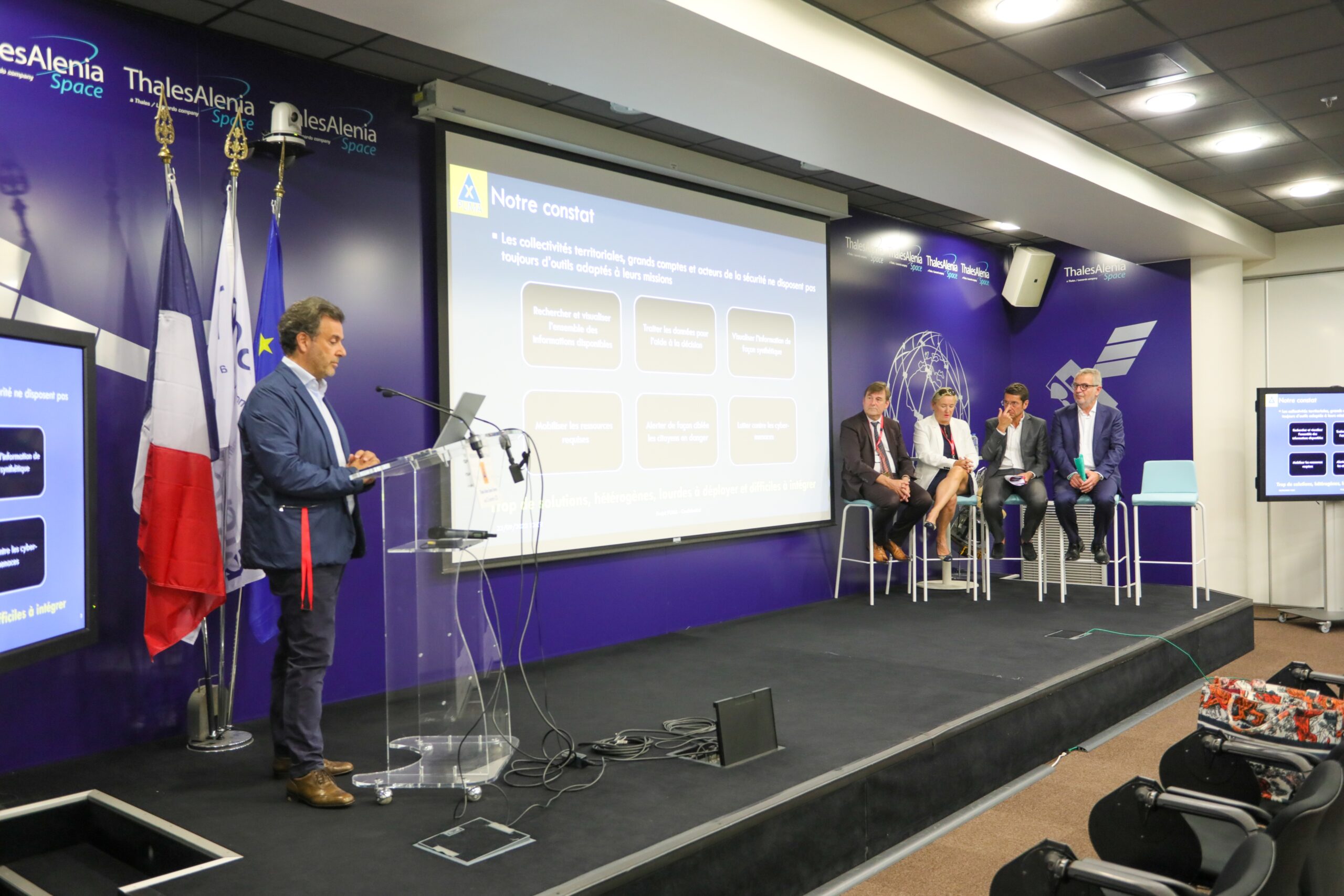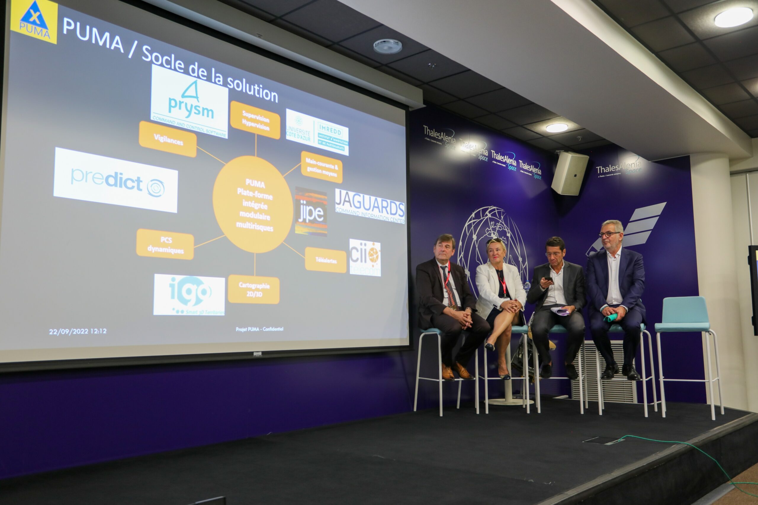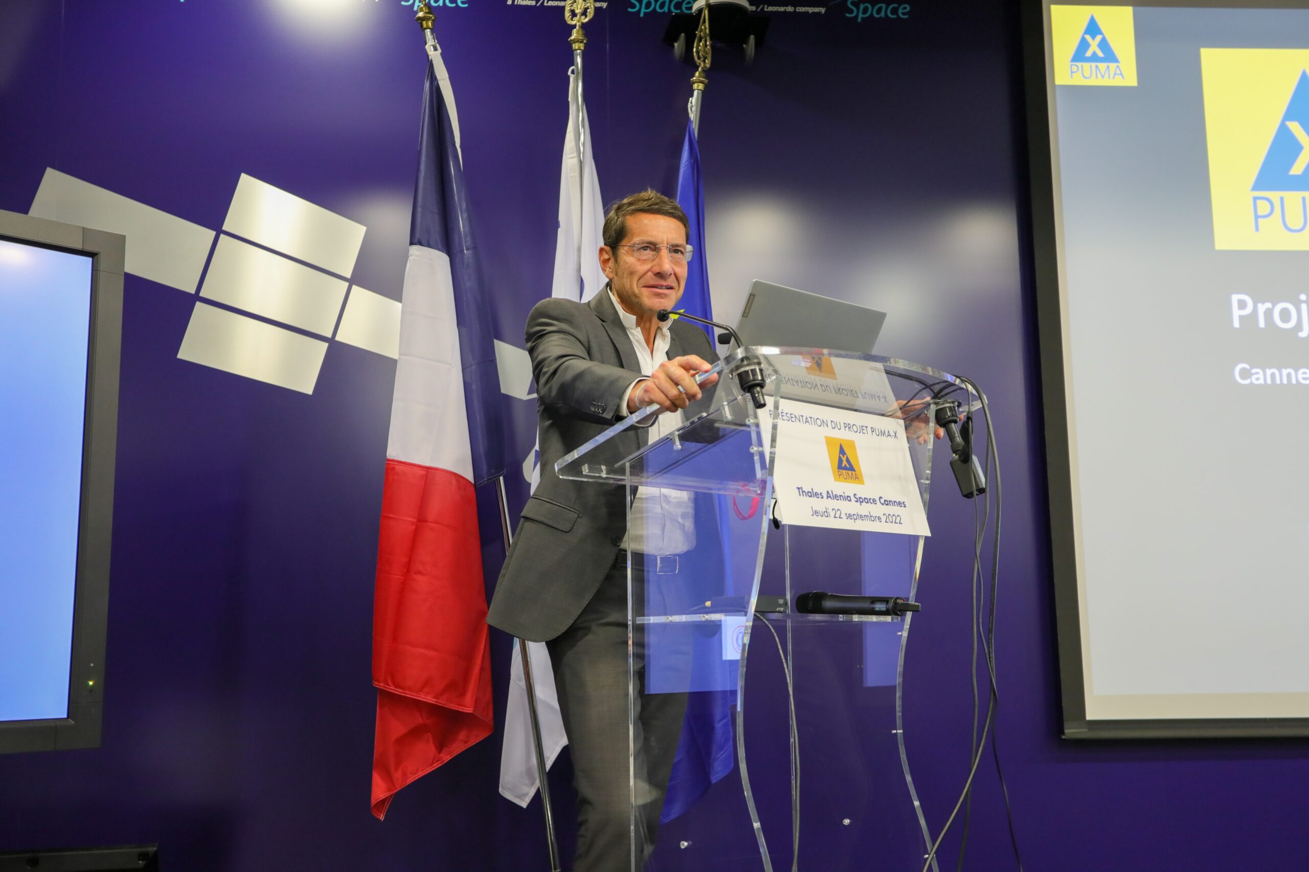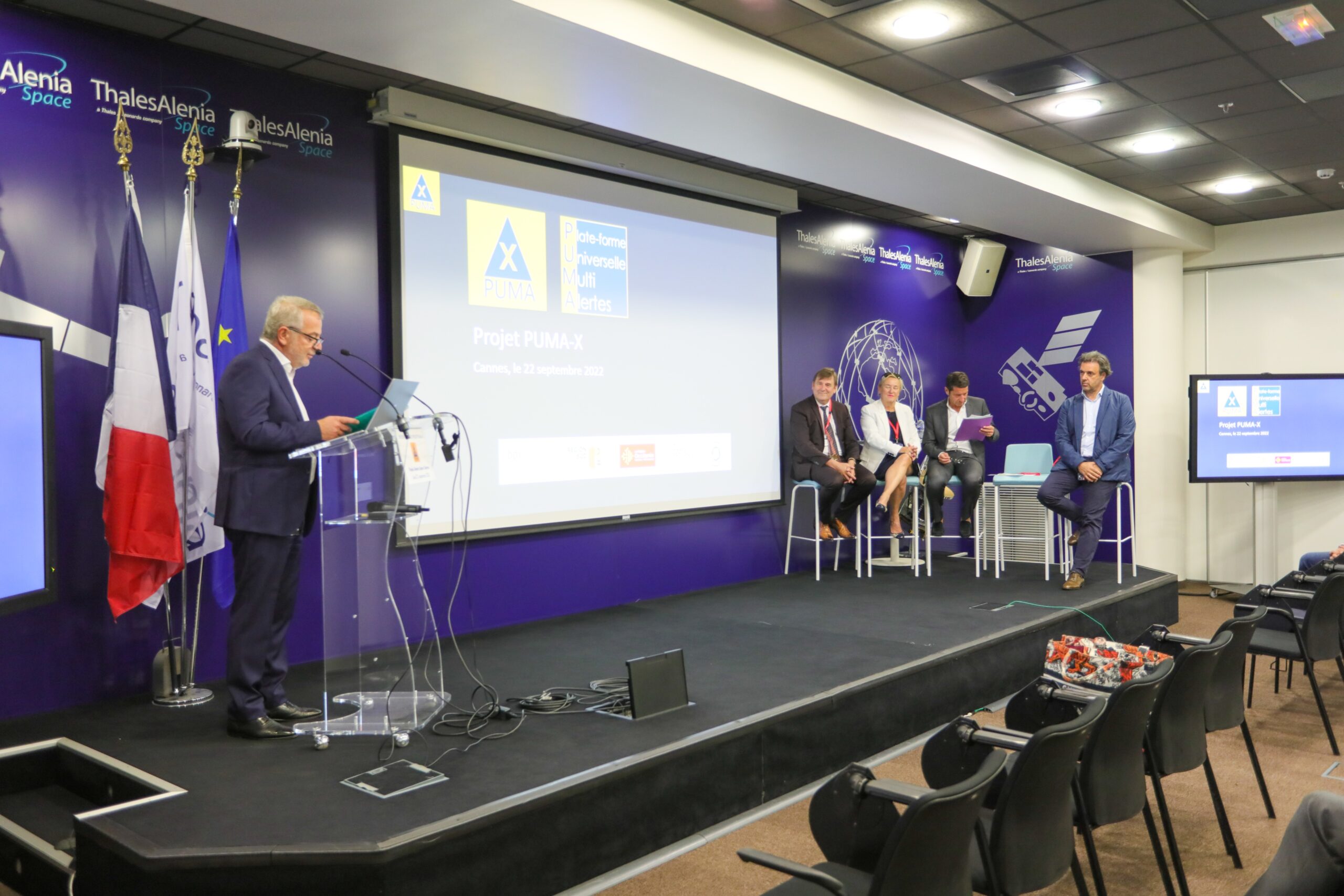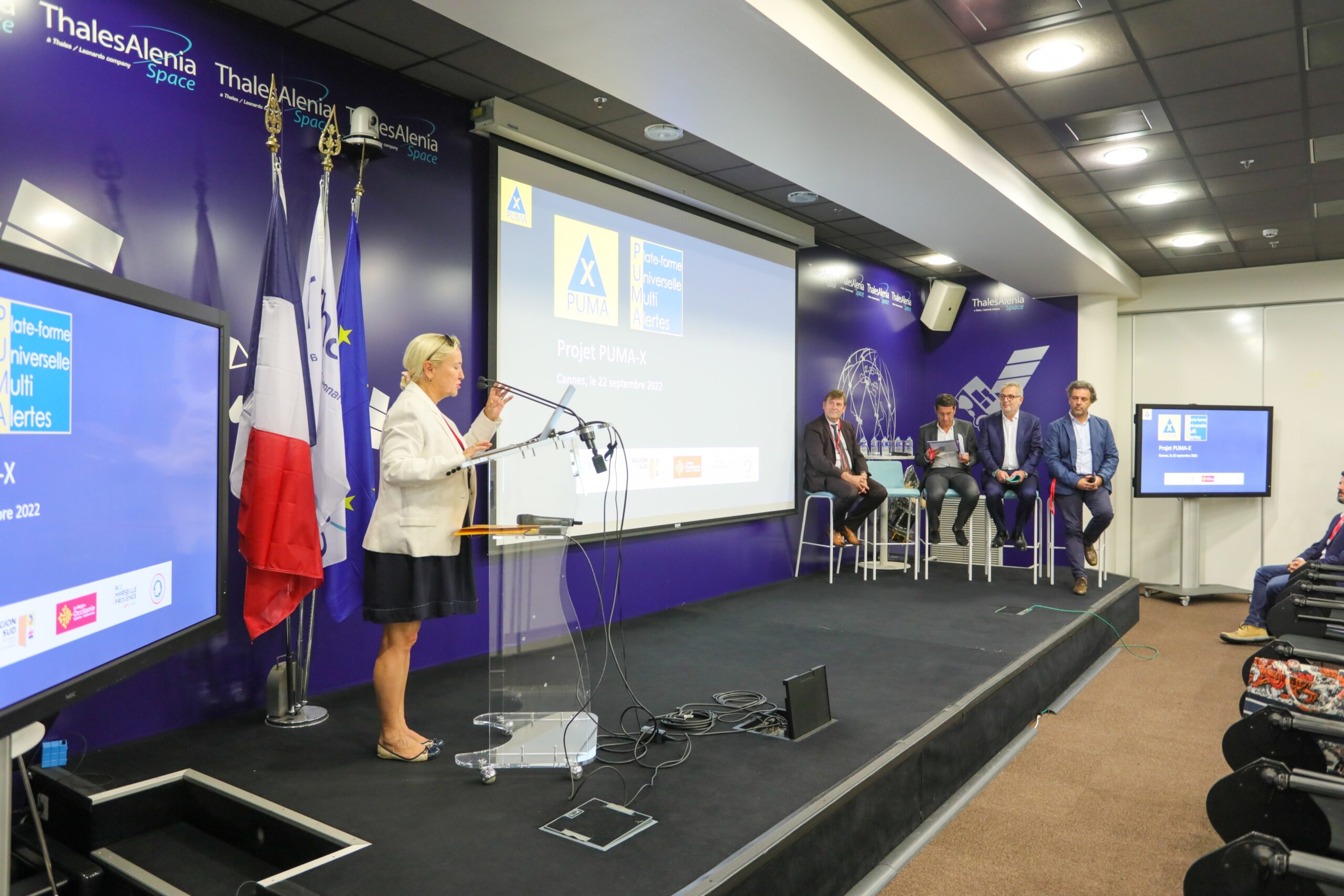 Le projet collaboratif PUMA-X a été dévoilé hier matin (22 septembre 2022), dans les locaux de Thales Alenia Space, en présence de Françoise Bruneteaux, Adjointe au Maire de Cannes, Conseillère régionale de la Région Sud et soutien de la première heure au projet, et de David Lisnard, Maire de Cannes, Président de l’agglomération Cannes Lérins, territoire accueillant la première expérimentation de PUMA-X. Une véritable rupture technologique pour mieux protéger les populations des risques croissants.