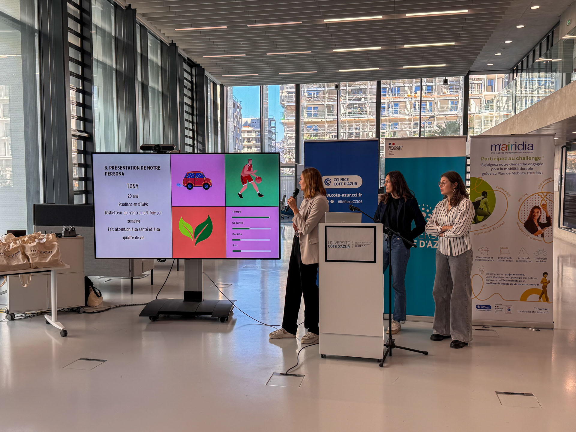 Toutes ont travaillé autour d’une problématique commune : la sensibilisation aux mobilités durables dans le quartier Méridia, en lien avec les publics identifiés lors de focus groups organisés en janvier 2024 (jeunes, étudiants, salariés, étudiants STAPS).