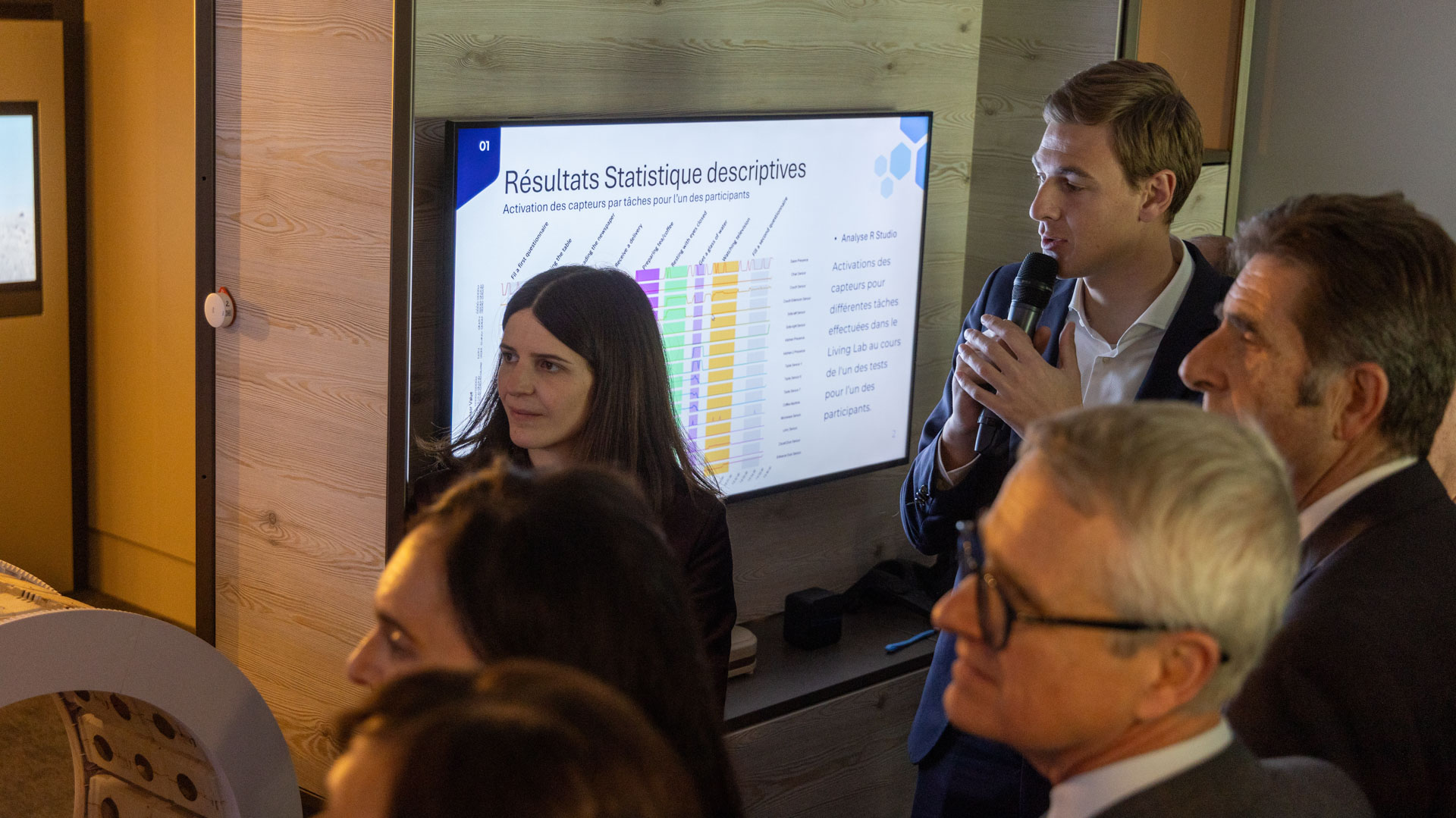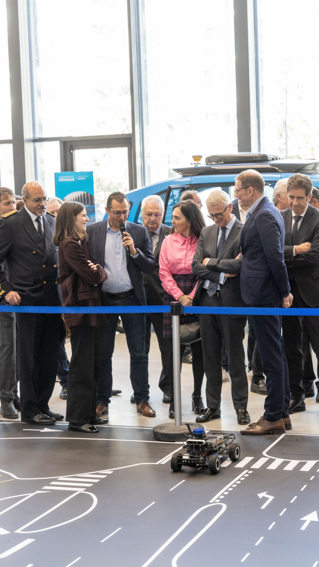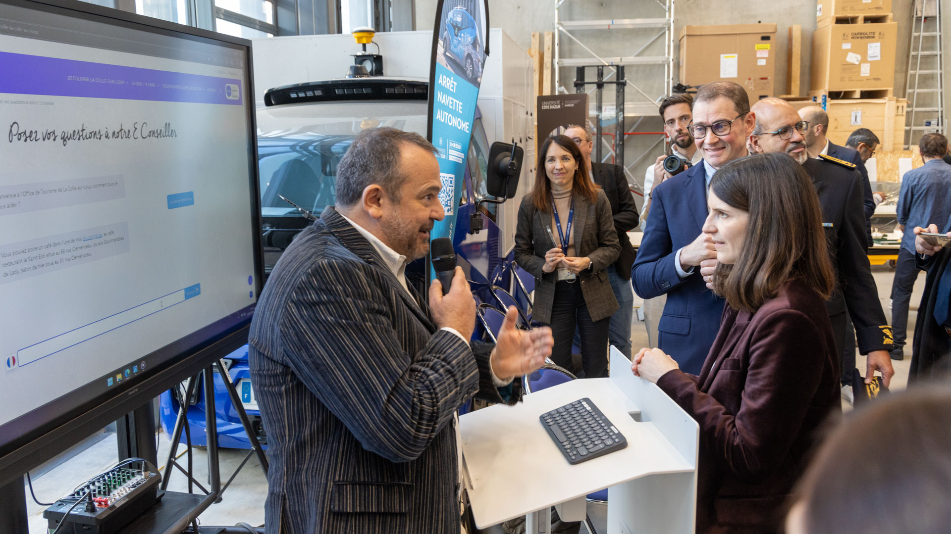 Devant les navettes autonomes stationnées sur la plateforme technologique, Paulo Moura a présenté les avancées de la Chaire « Territoire et Navettes Autonomes ». Le potentiel des véhicules autonomes dans des contextes variés — de la ville dense aux zones rurales — a été mis en évidence. Cette démonstration a été complétée par la présentation du chatbot IA touristique développé par Webelse.